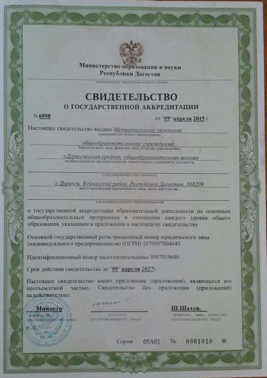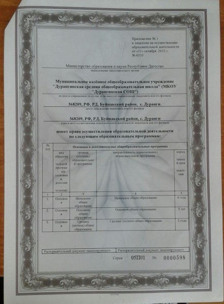 | Адрес местонахождения образовательной организации* | 368209, Буйнакский район, с.Дуранги |